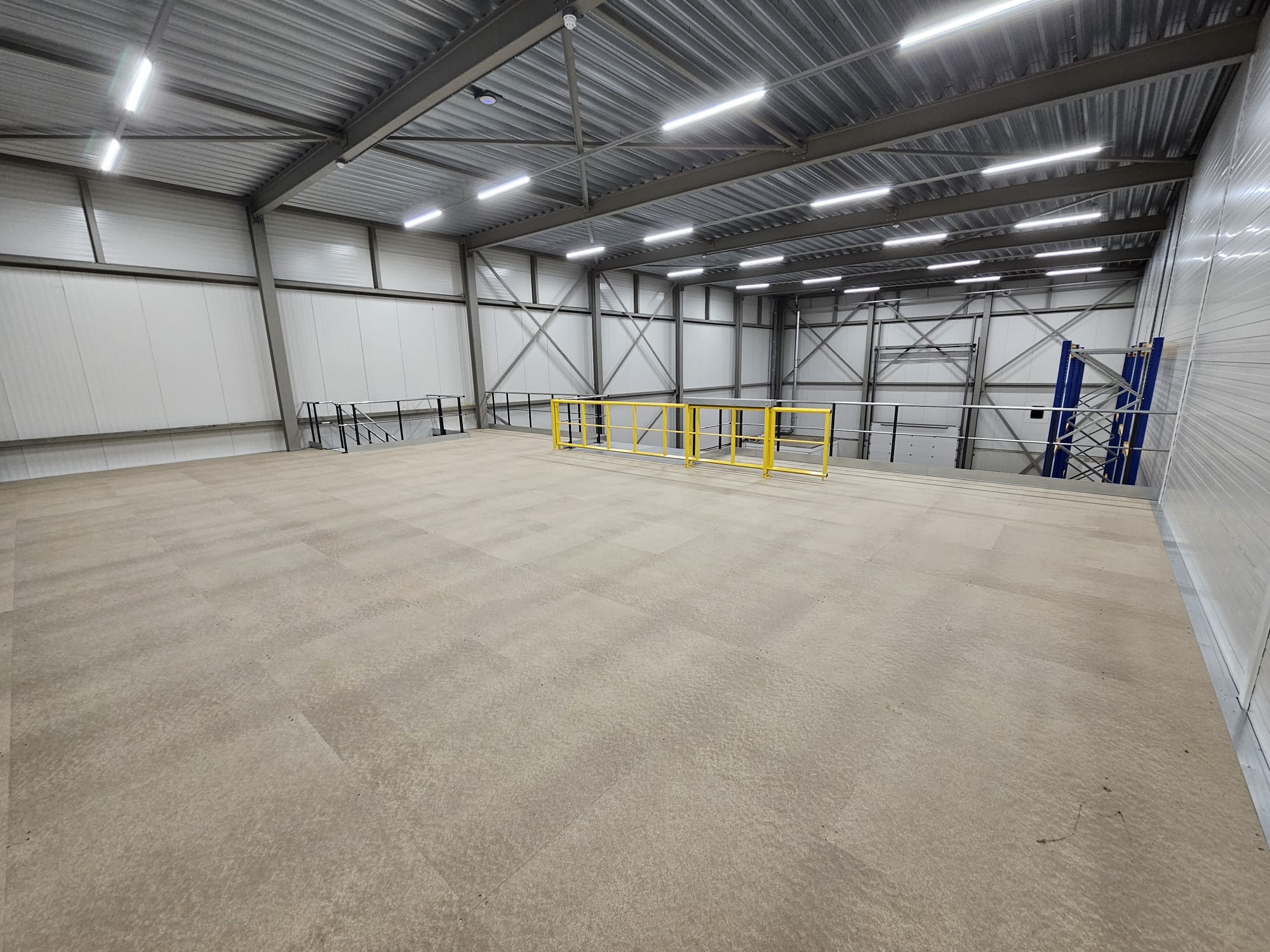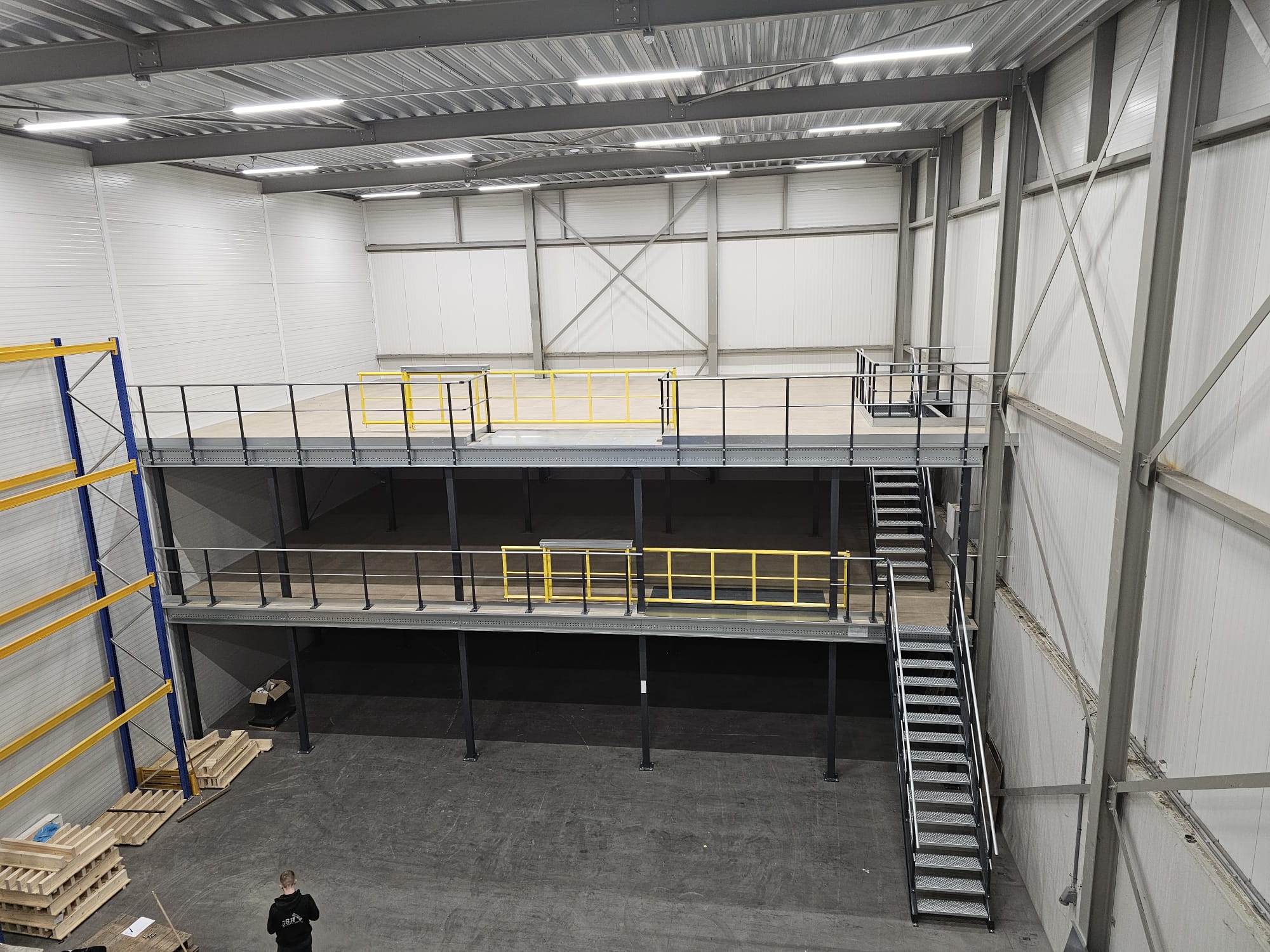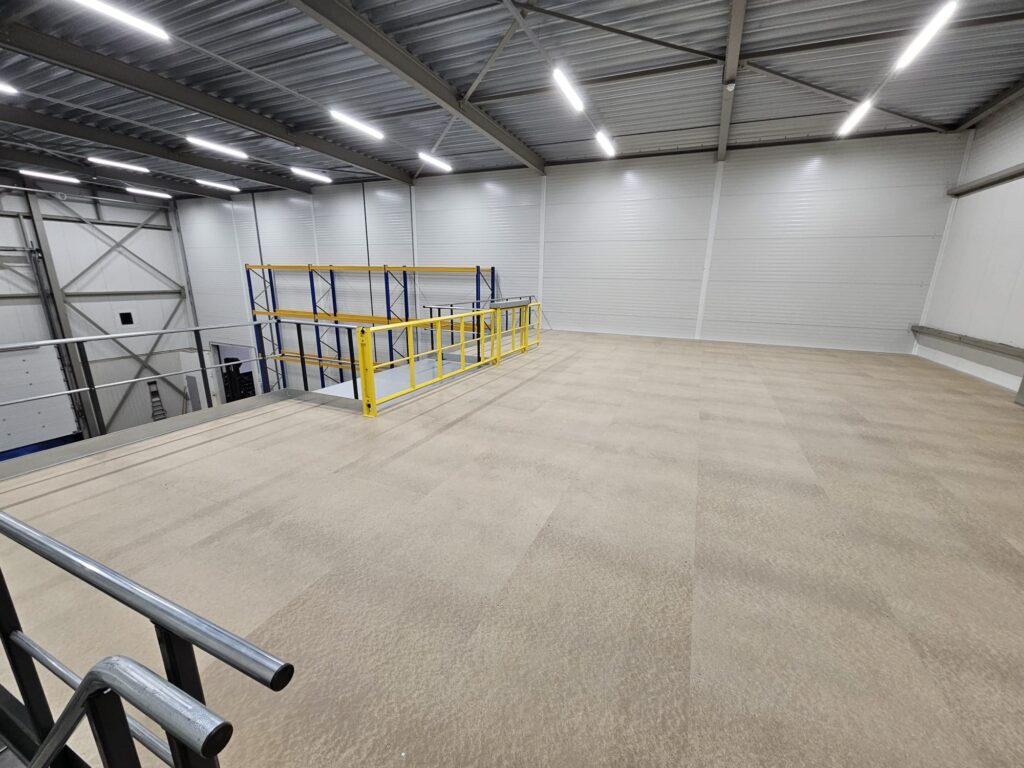 For ACS Audiovisual Solutions, Nolte Mezzanine installed a two-level mezzanine floor with a total surface of 290 m². The floor is built from cold-rolled profiles with a chipboard finish, placed on a column grid of approximately 3,300 x 4,700 mm. Thanks to this efficient construction, the space could be fully optimized for storing audiovisual equipment without losing flexibility on the ground floor.
