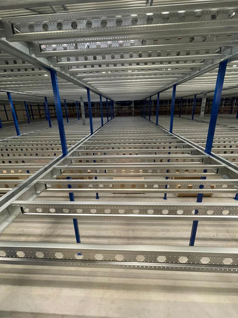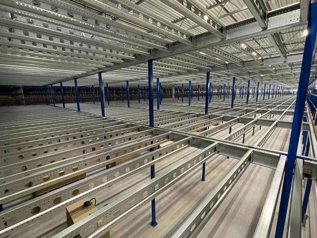 The mezzanine was built from cold-rolled profiles with a column grid of approximately 5,000 x 4,500 mm, finished with a chipboard floor. With floor heights of +4,968 mm and +8,000 mm and stability provided by portals, the structure is suitable for intensive use as a storage and picking tower. This solution combines additional capacity with an efficient and safe logistics layout.