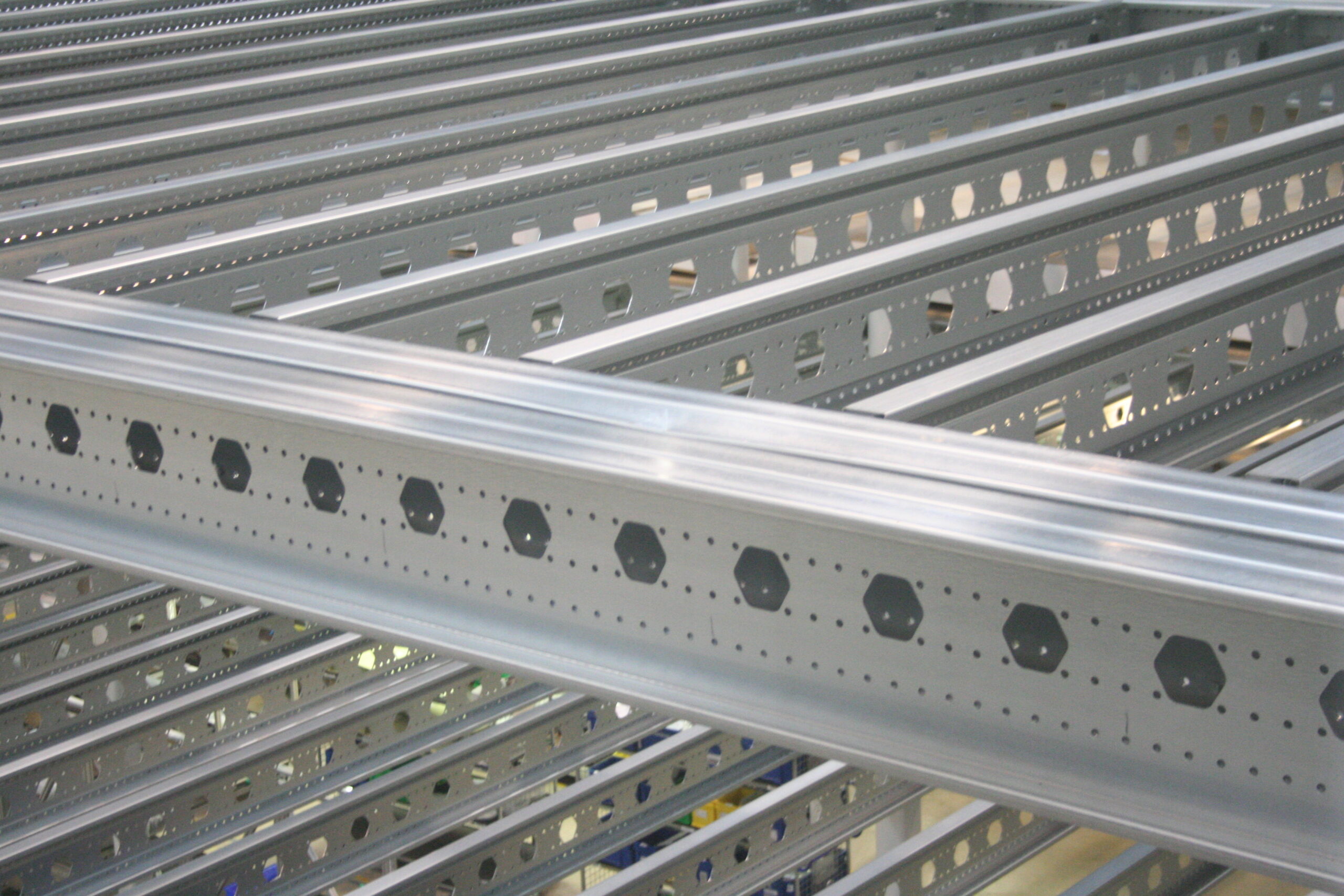 The mezzanine is divided into three functional levels at heights of +3,480 mm, +6,680 mm, +10,140 mm and +13,478 mm. Bracing ensures stability, even under intensive use. The roof structure on top was specifically designed to integrate the sprinkler system, a requirement in the aerospace industry and a guarantee of fire safety. This combination of technical precision and space efficiency resulted in a strong and smart total solution.